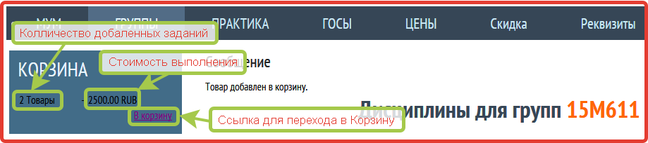 НЕ СТРАШНО, ЕСЛИ ВЫ ДОБАВИЛИ ЛИШНИЕ ЗАДАНИЯ, ПОТОМ ИХ МОЖНО УДАЛИТЬ. - После того, как Вы добавили все необходимые задание, переходите в корзину для оформления и оплаты заказа (Нажмите на ссылку для перехода в Корзину см. на рис. ниже)